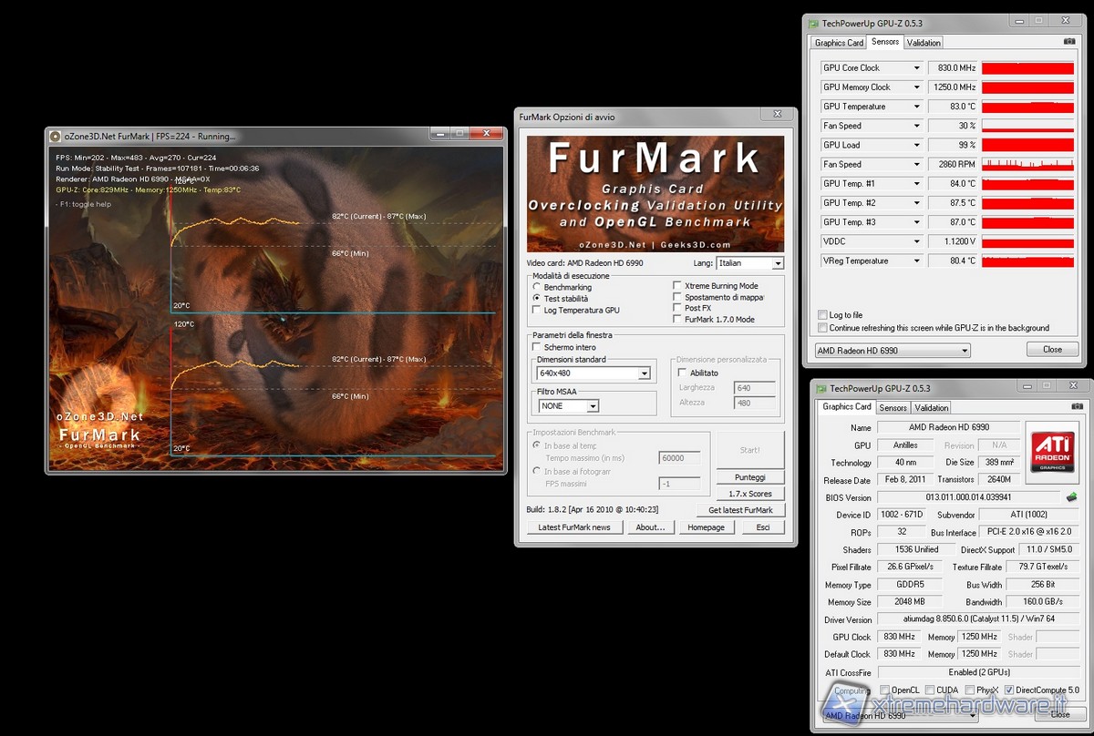 Analizziamo adesso le temperature fatte registrare durante i test con la AMD Radeon HD 6990 in modalità base con core grafico a 830 MHz ed in modalità OC con core grafico impostato tramite lo switch del bios ad una frequenza di 880 MHz. I test sono stati effettuati con la scheda a riposo, ossia idle, dopo accensione ed assestamento delle temperature, in situazione di gaming ed infine usando il software di benchmark FurMark che ha fatto registare le temperature più elevate. A tal proposito inseriamo gli screen effettuati durante questa fase per entrambe le impostazioni usate:
