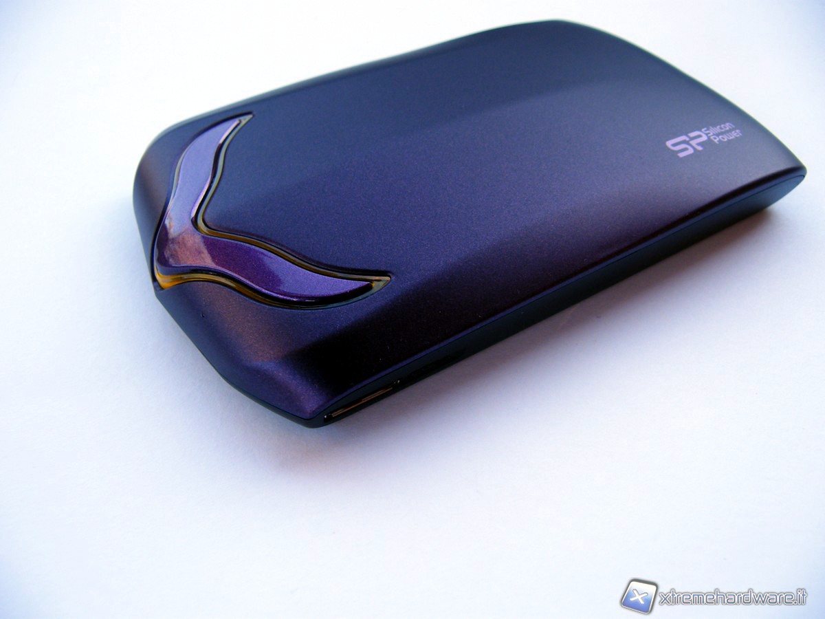 Tolto dalla sua confezione, la prima cosa che ci colpisce del prodotto è la sua estetica, assolutamente originale. Ciò è evidente prima di tutto nella forma dell'involucro esterno: non si tratta assolutamente della comune forma della maggior parte degli hard disk esterni, ma siamo di fronte ad una forma che sembra filante come quella di una supercar. Questo non è un caso: la forma dello chassis è stata pensata proprio prendendo inspirazione dalla bassa resistenza aerodinamica di un'automobile sportiva. Questo non basta per stupire, perché anche il colore, tra il fucsia ed il violetto metallico, lo distingue nettamente da altri prodotti simili. Bisogna sottolineare anche come questa colorazione sia stata effettuata tramite un trattamento particolare che, oltre a questo eccezionale effetto estetico, impedisce che si possano lasciare impronte delle dita sulla superficie del prodotto, mantenendo il loro originale aspetto satinato.