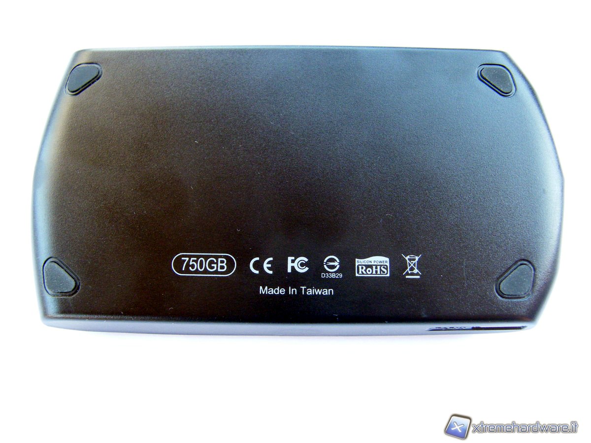 Sulla superficie inferiore notiamo la presenza di 4 piedini, collocati ciascuno in prossimità dei vertici di questo lato, in modo tale da evitare sempre il contatto della superficie col piano d'appoggio. Abbiamo poi una serie di scritte bianche che ricordano la capacità del prodotto, la necessità di smaltirlo soltanto nei siti appositi per la raccolta di rifiuti elettronici e “made in Taiwan”, oltre alle varie certificazioni: RoHS, CE, FC, D33B29.